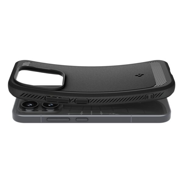 The flexible Spigen Rugged Armor case features a modern, carbon-fiber texture. Its slim design perfectly adapts to the phone without altering its original silhouette.