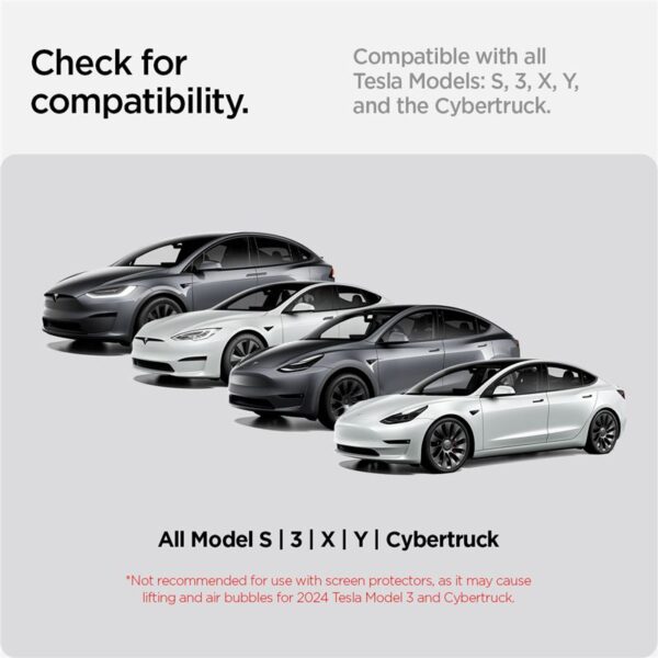 A universal phone holder compatible with all Tesla models (S, 3, X, Y, Cybertruck) and most smartphones with a width of 6.5 – 9.5 cm (2.56″ – 3.74″).
