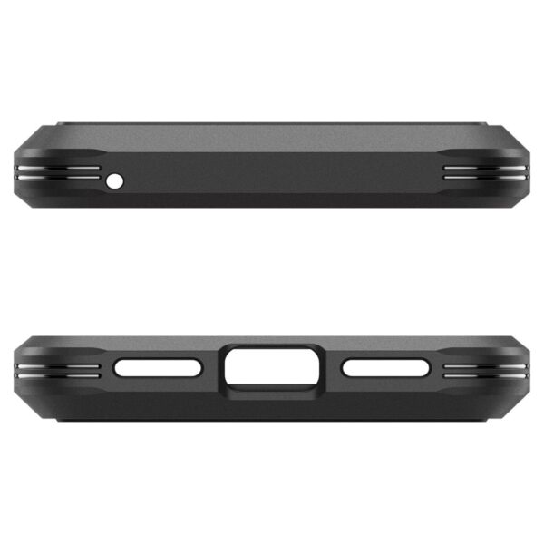 Spigen Tough Armor is a hybrid case with an inner layer made of durable and shock-resistant flexible TPU, and a hard and durable polycarbonate outer panel. The interior is completed with a thin layer of shock-reducing foam. The case is easy to fit and its slightly protruding edges protect the camera and screen from scratches on flat surfaces.