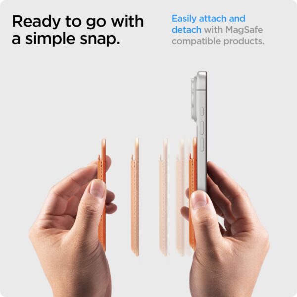 The Spigen Valentinus is a magnetic card wallet made of vegan PU leather that attaches to the back of your phone or MagSafe-enabled case in a single movement. Slim and lightweight, it completely eliminates the need to carry a traditional wallet – just grab your essentials.