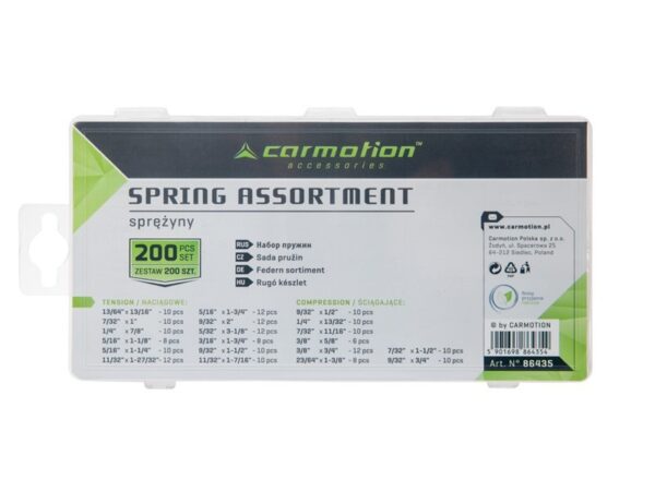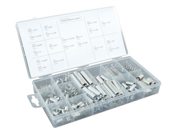 Set of springs in 20 different sizes, made of galvanized steel. Set includes extension springs and tension springs. Extension springs: 13/64 „x 13/16” – 10pcs 7/32 „x 1” – 10pcs 1/4 „x 7/8” – 10pcs 5/16 „x 1-1 / 8” – 8pcs 5/16 „x 1-1 / 4” – 10pcs 11/32 „x 1-27 / 32” – 10pcs. Tension springs: 9/32 „x 1/2” – 10pcs 1/4 „x 13/32 „- 10pcs 7/32” x 11/16 „- 10pcs 3/8” x 5/8 „- 6pcs 3/8” x 3/4 „- 12pcs 23/64” x 1- 3/8 „- 8pcs 7/32” x 1-1 / 2 „- 10pcs 9/32” x 3/4 „- 10pcs