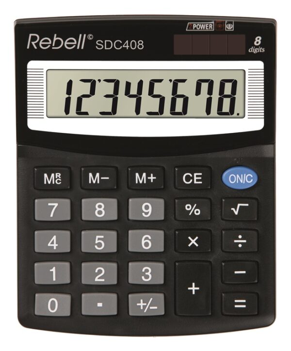 Prekės ženklas- Rebell. Artikulas- SDC408. Ilgis- 12.5 cm. Plotis- 10 cm. Aukštis- 2.7 cm. Spalva- Juoda. Medžiaga- Plastikas. Skaitmenys ekrane- 8. Skaičiuotuvo tipas- Stalinis. Funkcijos- Procentų funkcija, šaknies funkcija, matematinės funkcijos, 3 atminties mygtukai.. Privaloma garantija- 24 mėn. Papildoma informacija- Maitinamas saulės baterijomis ir elementais. Be tekstinės atminties. .