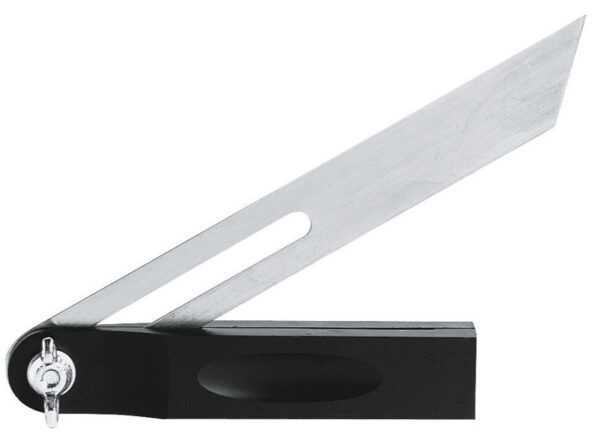 Reguliuojamas stalių kampainis 200 mm. Plastikinis pagrindas. Nerūdijančio plieno, nikeliuota liniuotė. Paprastas fiksavimo mechanizmas.