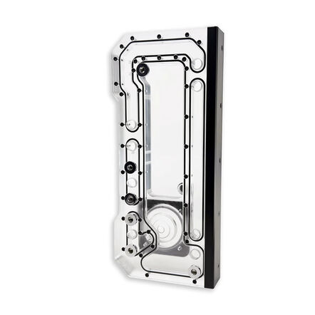 The black-transparent distro plate features a total of 15 G1/4-inch ports. This provides enough connections for graphics cards and processors. Additionally, the GPU can be connected flexibly, making, for example, straight hard tubing easier for you. Vertical installation of the graphics card is just as possible as horizontal. Besides the CPU, two radiators – one at the top and one at the bottom – can also be mounted, ensuring your system is sufficiently cooled.