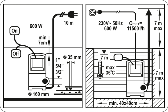 Panardinamieji siurbliai, skirti švaraus ir užteršto vandens perpumpavimui, aeravimui bei cirkuliacijai iš lietaus vandens talpyklų ir šulinių. Gali būti naudojami vandeniui iš baseinų, rūsių, iškasų išpumpuoti, naudojami namų ūkiuose ir žemės ūkyje, sklypuose, statybvietėse. • automatinis plūdinis jungiklis, reaguojantis į kintantį vandens lygį • korpusas iš smūgiams atsparaus plastiko • tvirta konstrukcija • maks. panardinimo gylis: 7 m • maks. nešvarumų dydis: 25 mm • maks. vandens temp.: 35°C • gumuotas laidas: 10 m • jungties adapteriai: 1″, 1-1/4″, 1-1/2″ GALIA [W]: 600 NAŠUMAS [l/h]: 10 000 VANDENS KĖLIMO AUKŠTIS (m): 5,5