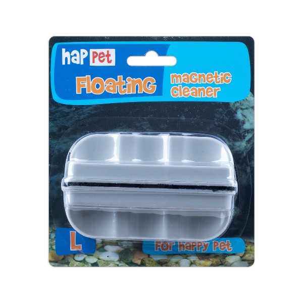 Magnetas skirtas valyti akvariumo stiklus. Pusėms atsikabinus magnetas išplaukia į paviršių. Valymo paviršius 11x5cm dydžio, L dydis. Valymas atliekamas šiurkštesne puse iš akvariumo vidaus, švelnesne iš išorės. Gamintojas: HapPet, Lenkija.