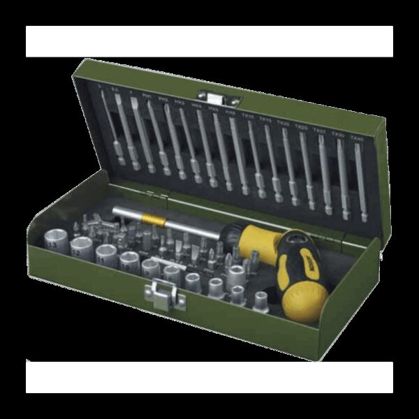 - Rinkinys su 38 vnt. 1/4″ (6,3 mm) standartinio ilgio (25 mm) antgaliais ir 16 vnt. ilgų (80 mm) antgalių įsriegtoms akloms kiaurymėms