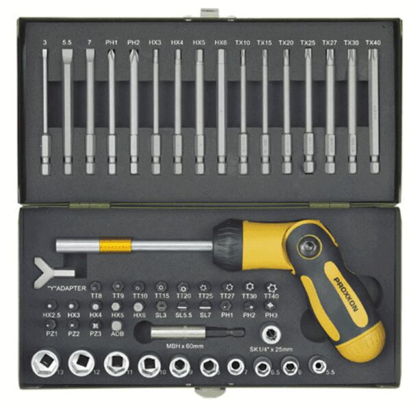 Sukimo antgalių rinkinys su sulenkiama terkšle PROXXON, 54-ių dalių