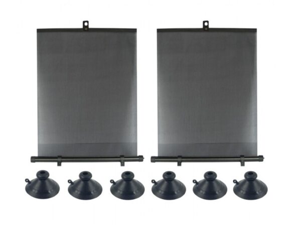 The set includes 2 car sunshades with hooks and 6 suction cups.