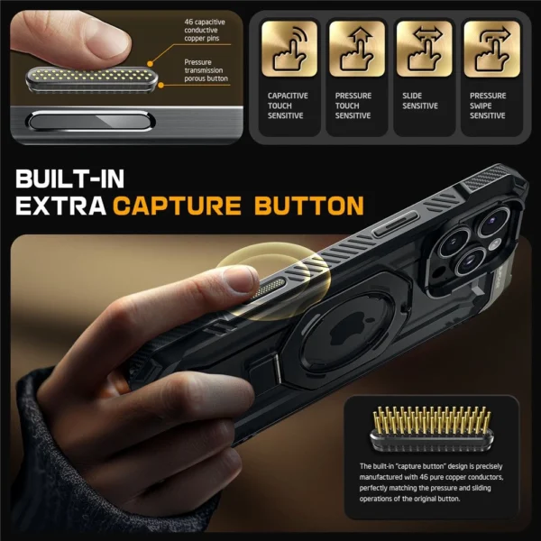 Additionally, the case is compatible with MagSafe technology, which allows for fast magnetic charging and secure attachment to accessories. The built-in MagSafe ring also acts as a stand and grip, which increases the comfort of using the device.