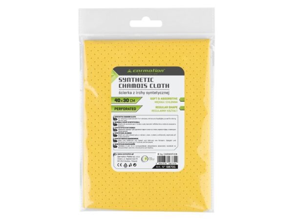 Dimensions: 40 x 30 cm. A cloth made of synthetic chamois leather, fully perforated. Perfectly dries smooth surfaces (windscreen, mirrors, headlights, cockpit). It is soft and pleasant to the touch. Perfect absorbency. It does not leave streaks or marks. It can be used in every household and car repair shop.