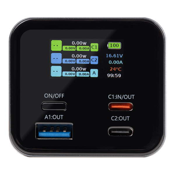 - Ekranas: TFT ekranas rodo įėjimo/išėjimo galią, baterijos lygį ir įkrovimo eigą.