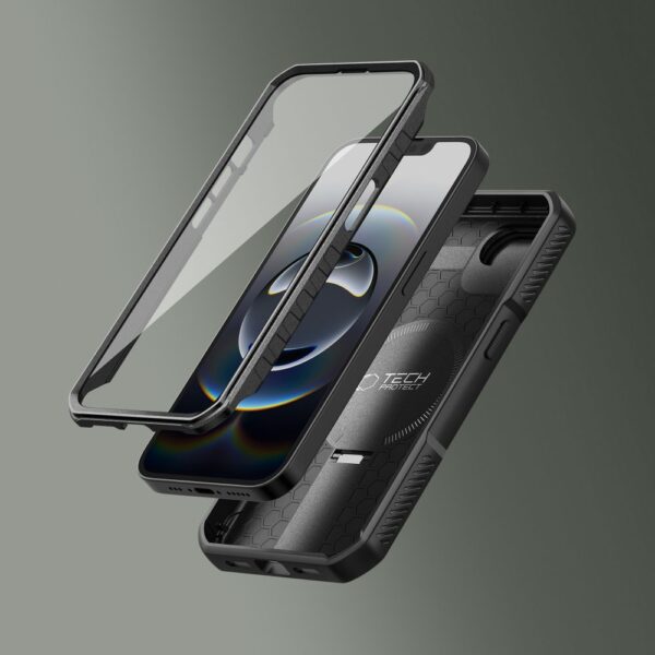 Dviejų dalių dėklas sujungia kietą šarvuotą nugarėlę, pagamintą iš PC ir smūgiams atsparaus TPU. Papildomas sutvirtinimas kampuose – apsauginės oro pagalvės – efektyviai amortizuoja bet kokį kritimą. Įrenginio priekis apvyniotas rėmu su integruotu polikarbonato dangteliu. Šis sprendimas efektyviai izoliuoja ekraną, apsaugodamas jį nuo įbrėžimų.