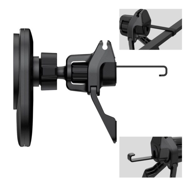 The 360° adjustable metal arm allows you to position your phone in any angle and direction – both vertically for calls and horizontally for navigation. A flexible air vent clip with silicone protection minimizes wear on the vent blades, while a suction cup on the dashboard ensures a secure, residue-free fit.