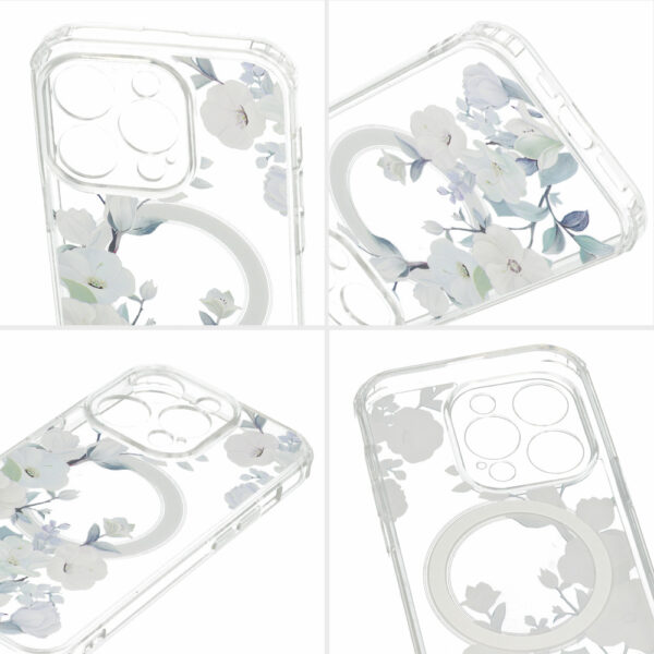 Tel Protect Flower Magsafe – is a transparent case, decorated with a unique flower pattern. The case protects the back, sides and screen of the smartphone. Magnets built into the case make it compatible with Apple MagSafe accessories.