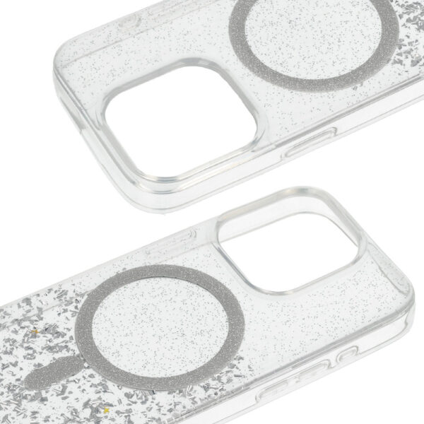 Tel Protect Moonlite Magsafe Case is a shimmering case made of flexible TPU material (sides) and hard Acrylic (back). The case protects the back, sides, camera and screen of the smartphone. Magnets built into the case make it compatible with Apple MagSafe accessories.