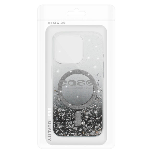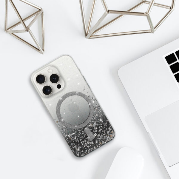 Tel Protect Moonlite Magsafe Case is a shimmering case made of flexible TPU material (sides) and hard Acrylic (back). The case protects the back, sides, camera and screen of the smartphone. Magnets built into the case make it compatible with Apple MagSafe accessories.