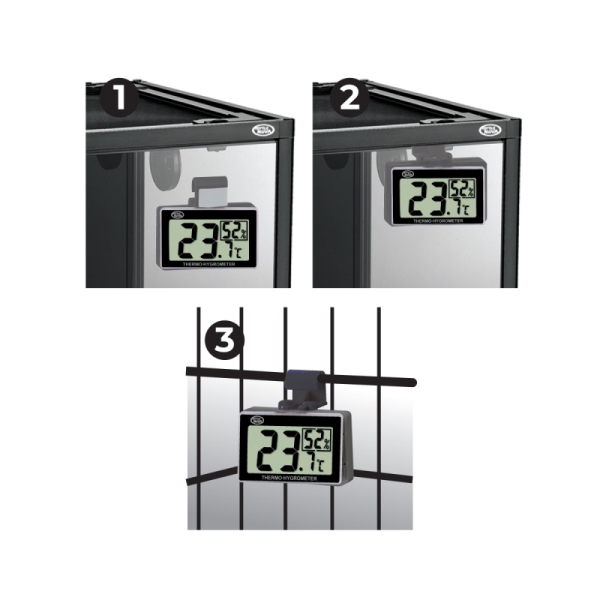 Skaitmeninis termometras su drėgmės matavimu. Didelis matavimo tikslumas, skirtas montuoti terariumo viduje klijuojant arba pakabinant. Įtraukite bateriją