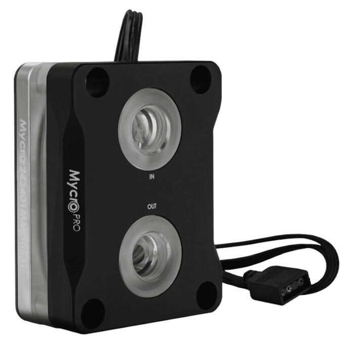Between the cold plate and the anodised aluminium cover is acrylic glass, which undergoes a tempering process after milling to relieve internal stresses. This ensures that no stress cracks form in the acrylic glass even after prolonged use, as can occur with hardened acrylic glass. Under the aluminium cover are RGB LEDs, which are controlled via a 3-pin ARGB header (+5V/DATA/GND) through the motherboard. The LEDs illuminate the acrylic glass beneath the cover and the G1/4-inch connections in the cover.