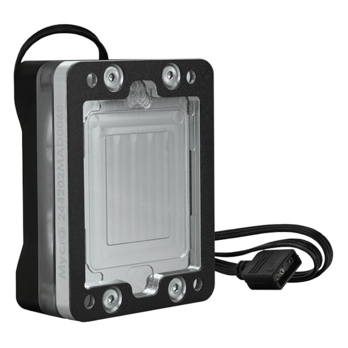 The Intel 1851 Mycro Direct-Die Pro RGB V1 features a jet system on the cooler surface, and the width of the cooling channel slots has been optimised. The cold plate of the cooler is made of nickel-plated copper and is mounted directly on the CPU chip. For this, the integrated loading mechanism (ILM) of the motherboard is removed, and the processor must be de-lidded. The nickel plating of the cooler plate creates a barrier layer, preventing gallium-based liquid metal from diffusing into the copper, and multiple applications of liquid metal are usually not necessary.