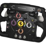 Thrustmaster TS-PC servo base, and detachable Ferrari 488 Challenge wheel with metal face plate. Ecosystem-ready.