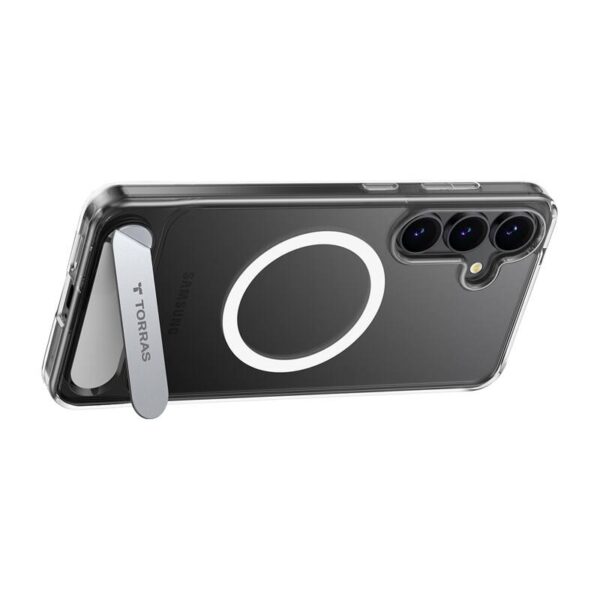The Torras Pstand case for Samsung S25+ features a magnetic design and offers a stable stand for comfort and protection of your device. It also allows fast wireless charging, and compatibility with magnetic accessories enhances its functionality.