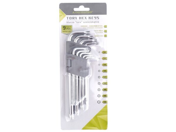 Set includes – 9 TORX keyes: T10, T15, T20, T25, T27, T30, T40, T45, T50 Keys made of chrome vanadium steel.