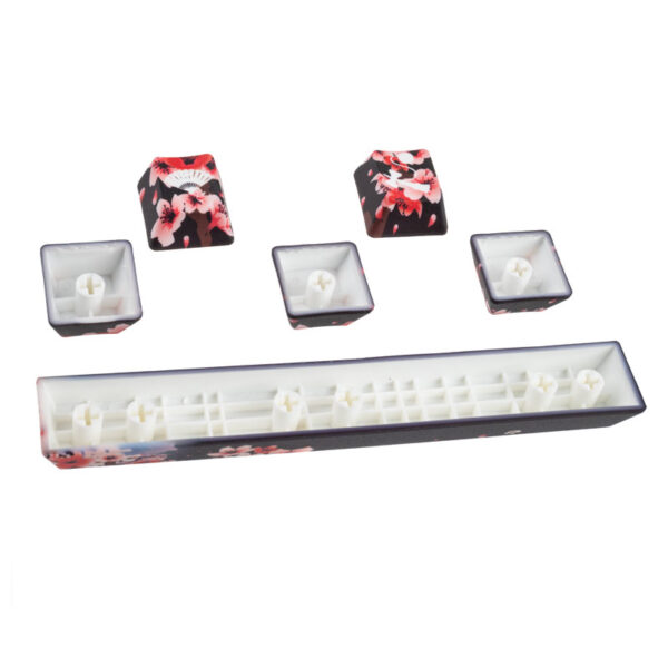 6 keycaps made of PBT, dye-sublimation printing, black with white and pink design, inspired by the Japanese cherry blossom