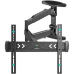 The LEVEL-750 wall mount has a profile depth of 4,2 cm and is suitable for screens that meet VESA hole pattern 100×100 to 600×400 mm. Its quickly connectable wall plate allows for multiple screen mounting, while a clever kickstand service position provides easy access to cables and connectors. Additionally, the wall plate is designed with specific cut-outs for wall sockets and securing devices and cables. It features various perforated holes for easy tie-wrap cable fixing and provides space for cable storage, ensuring a clean and tidy finishing.