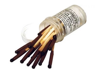 Pakuotės turinys: 25 degtukai, gesinimo vata, vandeniui nelaidus indas su dviem bokalais,