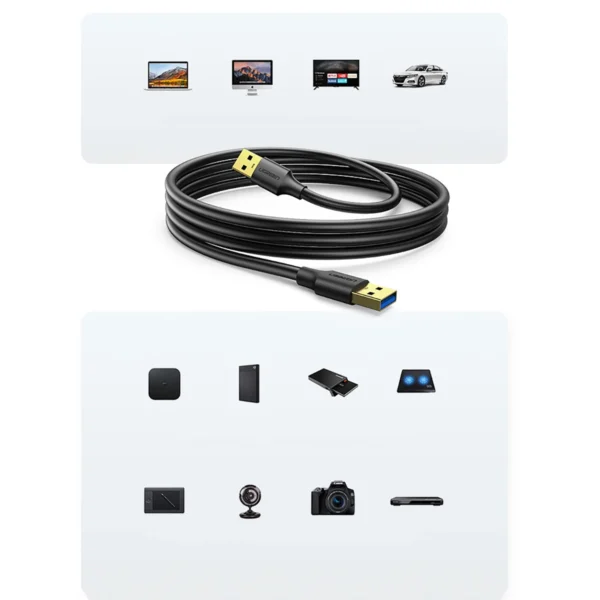 With the Ugreen US128 cable, you can connect a variety of devices without having to use several cables. You can use it to connect many devices, such as a laptop, computer, TV, hard drive, webcam, camera, DVD player. The list of compatible devices is really long! This is due to the very universal USB-A connector. Note: Not suitable for exchanging data between two computers.