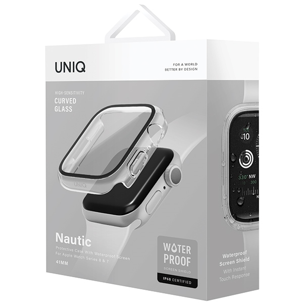 Uniq etui Nautic to smukły futerał ochronny z wodoodporną ochroną ekranu IP68. Technologia HydroDust Seal™ zapobiega przedostawaniu się wody do ekranu i nie wpływa na czułość dotyku. Konstrukcja case’a składa się z smukłego i eleganckiego etui ochronnego dokładnie okalającego kopertę zegaka Apple Watch i osłony ekranu wykonanej ze szkła hartowanego 9H zapewniającego extra przejrzystość HD. Łatwa konstrukcja zatrzaskowa nie wymaga demontażu paska na czas zakładania etui.