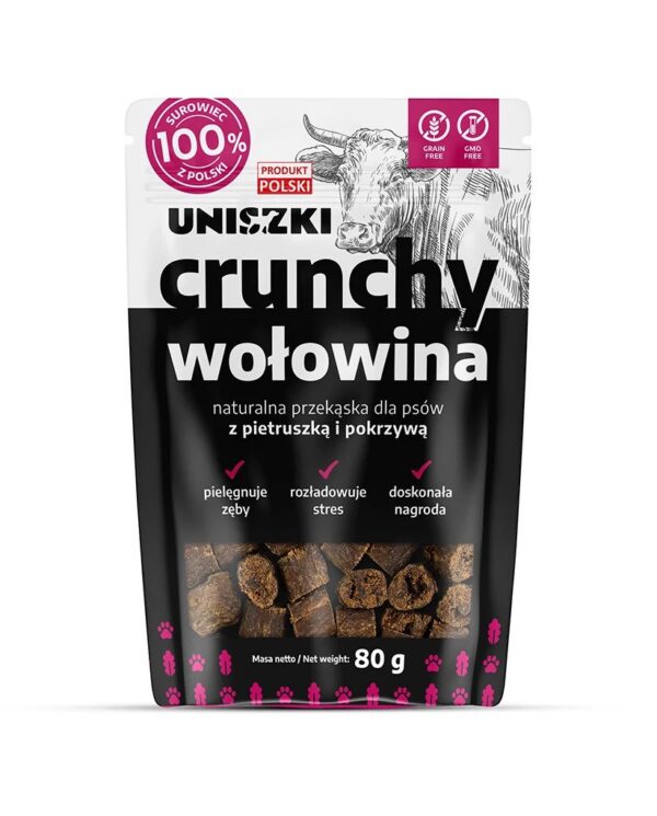 UNISZKI Crunchy Jautiena su Petrašolėmis ir Dilgėlėmis – Skanėstas Šunims – 80g