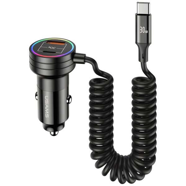 USAMS automobilinis įkroviklis 2xUSB-C 1xUSB-A C33 60W with spring cable Fast Charge juodos spalvos CC167CC01 (US-CC167)