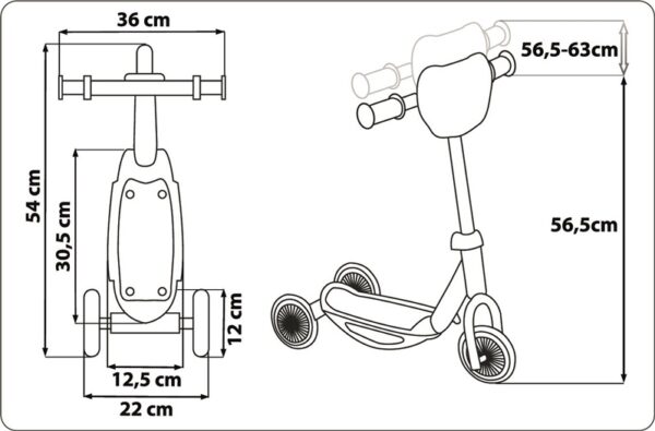 Prekės ženklas- -. Ilgis- 54 cm. Plotis- 22 cm. Aukštis- 63 cm. Svoris- 2.1 kg. Spalva- Mėlyna sp., Raudona sp.. Medžiaga- Plastikas, Plienas. Rėmo medžiaga- Plienas. Priekinių ratų skaičius- 1. Galinių ratų skaičius- 2. Priekinių ratų skersmuo- 120 mm. Galinių ratų skersmuo- 12 mm. Rekomenduojama ne jaunesniems kaip- 3 yr. Didžiausias naudotojo/-ų kūno svoris- 20 kg. Įspėjimas!- Netinka vaikams iki 3 metų., Naudoti su apsauginiu šalmu. Privaloma garantija- 24 mėn.
