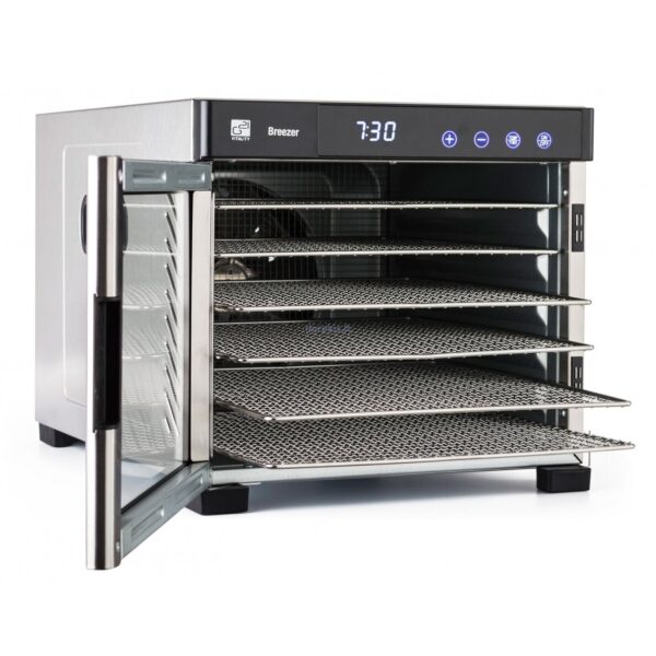 Skirtingai nuo kitų maisto džiovyklių, „G21 Breezer“ taip pat turi nerūdijančio plieno dureles, užtikrinančias mažesnes energijos sąnaudas, nepriekaištingą oro cirkuliaciją ir trumpesnį maisto džiovinimo laiką.