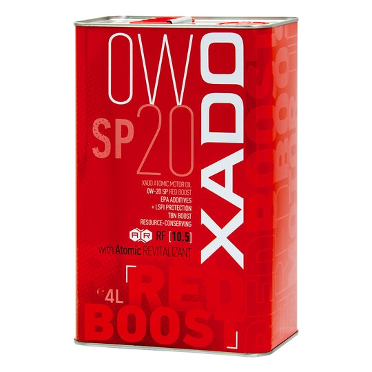 XADO Atomic Oil 0W-20 SP RED BOOST yra moderni degalus taupanti variklinė alyva, specialiai sukurta amerikietiškų ir japoniškų automobilių, visureigių, furgonų benzininiams varikliams, kuriems reikia naudoti žemo klampumo alyvas, pasižyminčias aukštesnėmis eksploatacinėmis savybėmis, atitinkančias keliamus reikalavimus. eksploatacinės savybės (API SR ) ir išteklių bei energijos taupymas (ILSAC GF-6). Atitinka griežčiausius 2010 metų JAV variklio apsaugos nuo nusidėvėjimo standartus. Alyva gali būti naudojama benzininiuose varikliuose, varomuose gamtinėmis dujomis (SND ir CNG) ir biodegalais, kurių sudėtyje yra iki 85 % etanolio (E85). Tinka Toyota, Honda ir Lexus hibridinėms transporto priemonėms ir gali būti naudojamas ten, kur nurodytas GM dexos1™, GM 6094M arba Chrysler MS 6395.