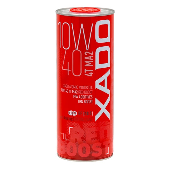 XADO Atomic OIL 10W-40 4T MA2 RED BOOST – tai aukštos kokybės naujos kartos alyva, skirta motorinių transporto priemonių 4-takčiams varikliams. Sukurta pagal specialią sudėtingų esterių technologiją, legiruota specialiu labai efektyvių priedų paketu, apsaugančiu nuo nusidėvėjimo, nuosėdų, dumblo ir oksidacijos bet kokiomis eksploatavimo sąlygomis. Skirtas naudoti turistinių, lenktyninių ir visureigių motociklų šlapios sankabos transmisijose.