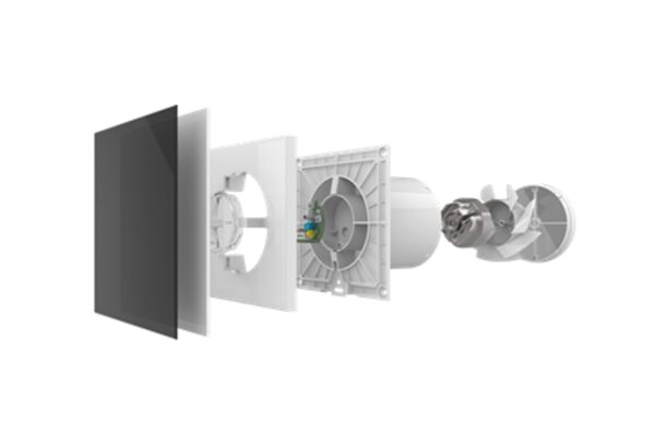 - Ventiliatorius Vlano EOS 100 T WH (Baltu stiklu su laikmačiu) – efektyvus sprendimas patalpų vėdinimui.