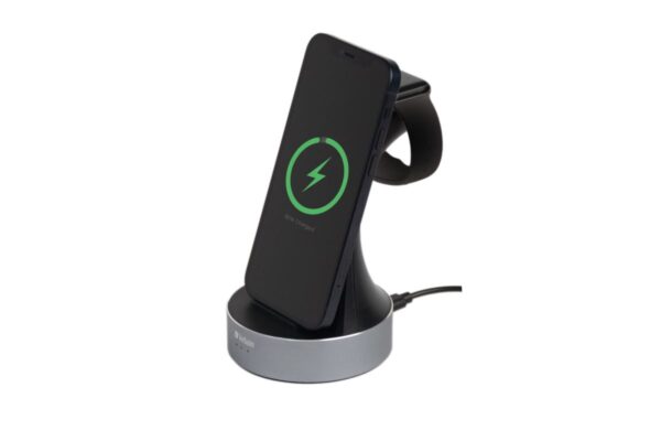 Charge your Apple Watch and iPhone (8 or later) or other Qi-certified wireless charging enabled device with Verbatim’s 2-in-1 charging station.