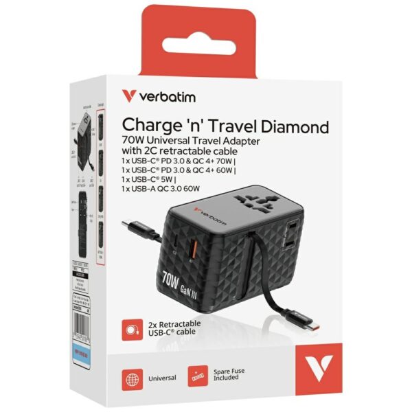 | Type | Verbatim Travel Adapter EU/UK/US GaN 1xUSB-C/1xUSB-A/2xUSB-C PD 70W |