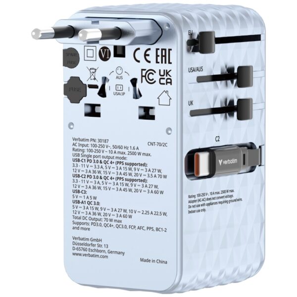 | Type | Verbatim Travel Adapter EU/UK/US GaN 1xUSB-C/1xUSB-A/2xUSB-C PD 70W |