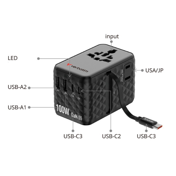 Type | Verbatim Travel Adapter EU/UK/US GaN 2xUSB-C/2xUSB-A/1xUSB-C PD 100W |