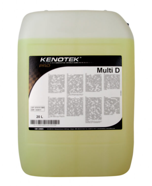 Tai maloniai greipfrutais kvepiantis stiprus, koncentruotas universalus valiklis/riebalų šalinimo priemonė, idealiai tinkanti, kai reikia pašalinti sunkiai įveikiamas dėmes, riebalus, nikotino ir rašalo dėmes. Jis valo greitai, efektyviai, nepalieka dryžių, o nuvalyti paviršiai nuostabiai blizga. MULTI D gali būti naudojamas su purkštuku, ištraukimo mašinoje, aukšto slėgio plautuve, pneumatiniame valymo aparate arba rankiniu būdu. pH – 11. Skiedimas: vidaus valyme 2%-5%; riebaus purvo ant įvairių paviršių valyme 5%-10%; labai stipriai prilipusio purvo ant variklių valyme 15%-25%. Naudojimas: užpurškite ant paviršiaus, leiskite tirpalui įsigerti. Niekada nenaudokite ant karštų paviršių.