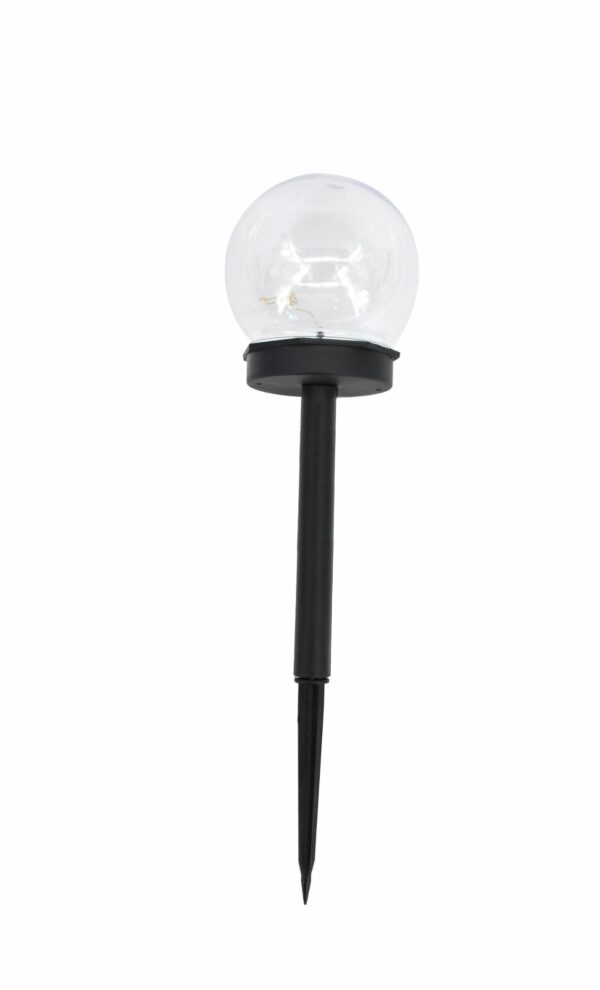 Saulės energija maitinamas šviestuvas, skaidraus plastiko gaubtas, rutulio skersmuo 10 cm. Bendras aukštis 35 cm. Maksimali galia: 0,3W Įtampa: 1,2V