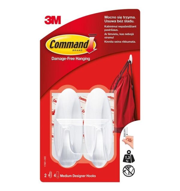 Prekės ženklas- 3M. Modelis- Command. Ilgis- 29 mm. Plotis- 30 mm. Aukštis- 80 mm. Spalva- Balta. Medžiaga- Plastikas. Tvirtinimas- Klijuojama. Kabliuko šakų skaičius- 1. Vienetai pakuotėje- 2. Privaloma garantija- 24 mėn. Garantija juridiniams asmenims- 12 mėn. Papildoma informacija- Komplekte yra 4 dvipusės lipsnios juostelės ir du kabliukai. Išlaiko iki 1.3 kg svorį..
