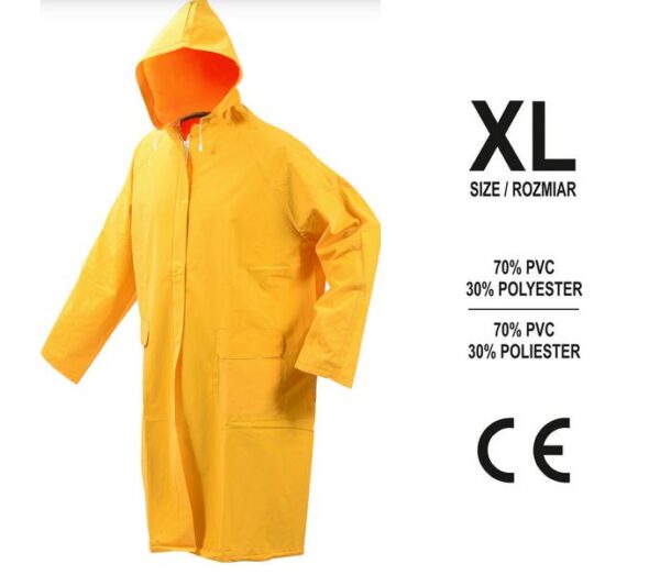Geltonas lietpaltis, 70% PVC, 30% poliesteris. Užsegamas užtrauktuku su papildomais spaustukais. Gobtuvas su raišteliais, dvi išorinės kišenės, rankogaliai su elastine juosta apsaugai nuo vėjo. Ventiliacijos sistema nugaros dalyje. EAN: 5906083746314 Vienetas: VNT Medžiaga: poliesteris, PVC Spalva: geltona Dydis: XL