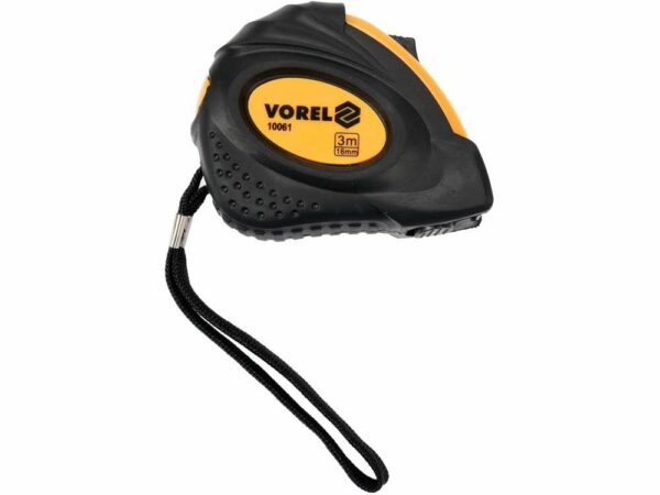 Sutraukiama plieninė matavimo juosta, 3m x 16mm. geltonos spalvos lakuota juosta, pagaminta pagal II tikslumo klasę, su metrine skale. užbaigta kilnojamu kabliuku vidiniams ir išoriniams matavimams, pritvirtintu trimis kniedėmis. matavimo prietaiso korpusas pagamintas iš geltono plastiko, sutvirtintas TPR apsaugomis. turi segtuką tvirtinimui prie diržo ir dirželį. matavimo prietaisas turi du fiksatorius: nuolatinį su slankiojančiu mygtuku ir greitąjį su mygtuku matavimo prietaiso pagrinde. Tiksliems atstumų iki 300 cm matavimams
