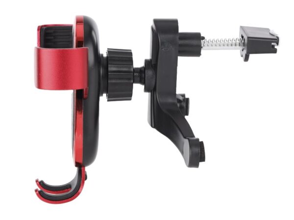 Universal gravity support to mount on the air inlet. The support automatically clamps its arms over the air inlet and releases those automatically when it needs to be removed. The holder is suitable for devices with a width of 65 to 85 mm. Made with the greatest care, perfect quality, in an aesthetic packaging. Red and black color, with red chrome elements. After removing it from the packaging, unscrew the nut on the back of the handle so that it is possible to insert the clamping ball on the air inlet. Adjust the tilt angle, tighten the nut and fix the bracket with the spring clip on the air inlet.