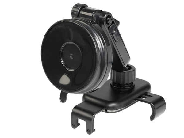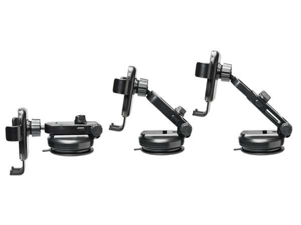 Practical and solid support fixed by a suction cup. It allows you to modify the length and inclination of the arm and adjust several angles using a rotating ball. Gravity locking and unlocking is done with one hand.